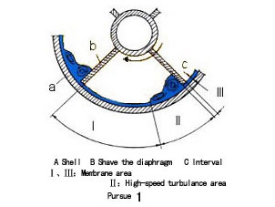 當待處理物料進入刮膜蒸發器后,先和轉子上的布料器相接觸,并被均勻地分配到內筒壁,然后靠一組刮膜片加速并立即在加熱面上形成(0.5~3.5mm)的液膜;在每一組刮膜片前端(II區)的流體形成一個渦流,在加熱面和葉片頂部之間間隙里的流體被高地湍動,并導致強烈傳熱和傳質,甚至高粘度產品在這湍動下產生高的熱傳遞系數。