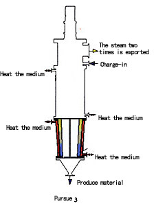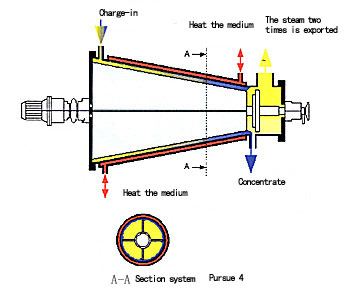 圓錐型薄膜蒸發器,依賴于轉子施于物料一個離心力,這離心力有兩個有效力,一個垂直于加熱面,另一個朝大直徑端體的方向(注意:相同的結果同樣出現在垂直圓錐型薄膜蒸發器里)依靠這些力產生物料加速,而且進入的物料保證加熱面充分潮濕,不依賴于蒸發比或進料速度。因此,局部物料過熱和熱降解被減少或完全消除。